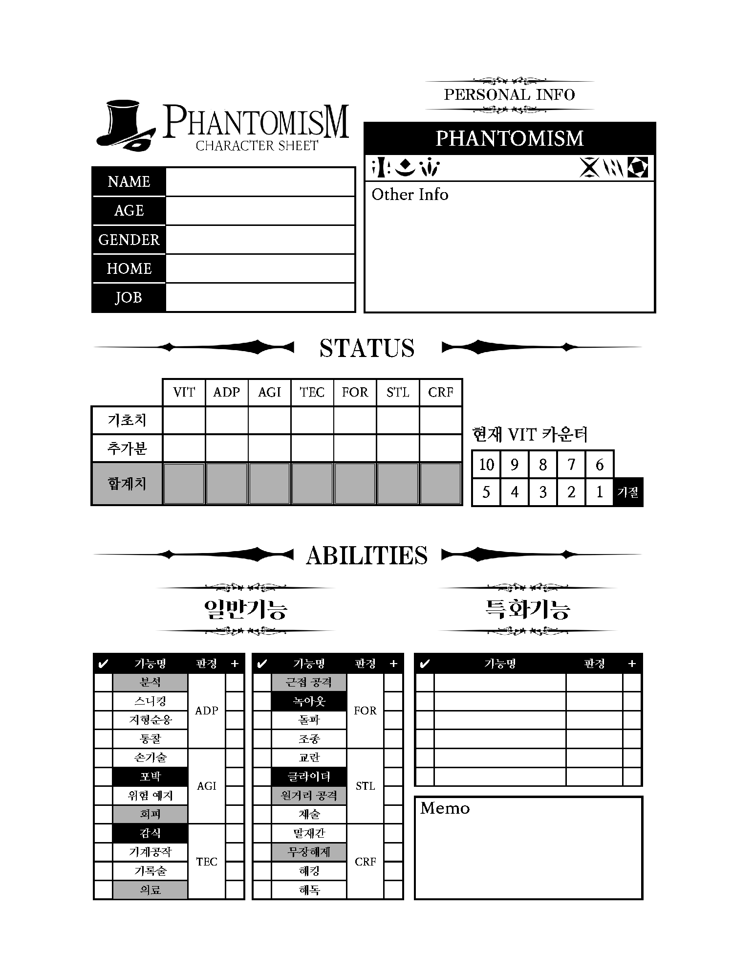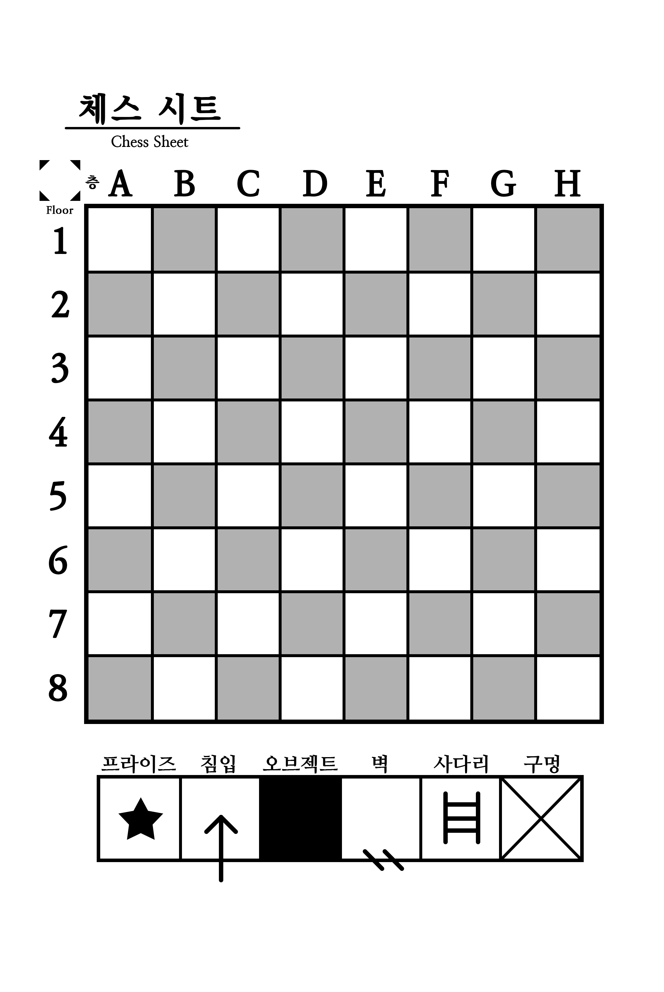 팬터미즘을 플레이하실 때 인쇄하여 사용하실 수 있는 체스 시트와 캐릭터 시트입니다.