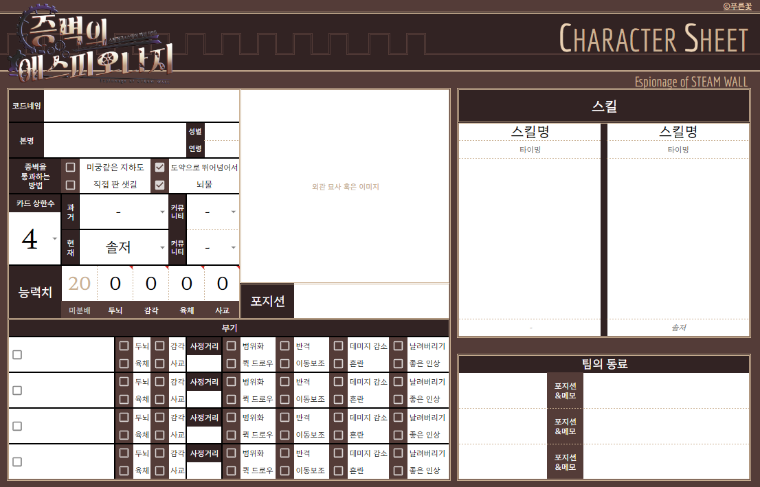 증벽의 에스피오나지 캐릭터 시트(구글 스프레드)입니다.