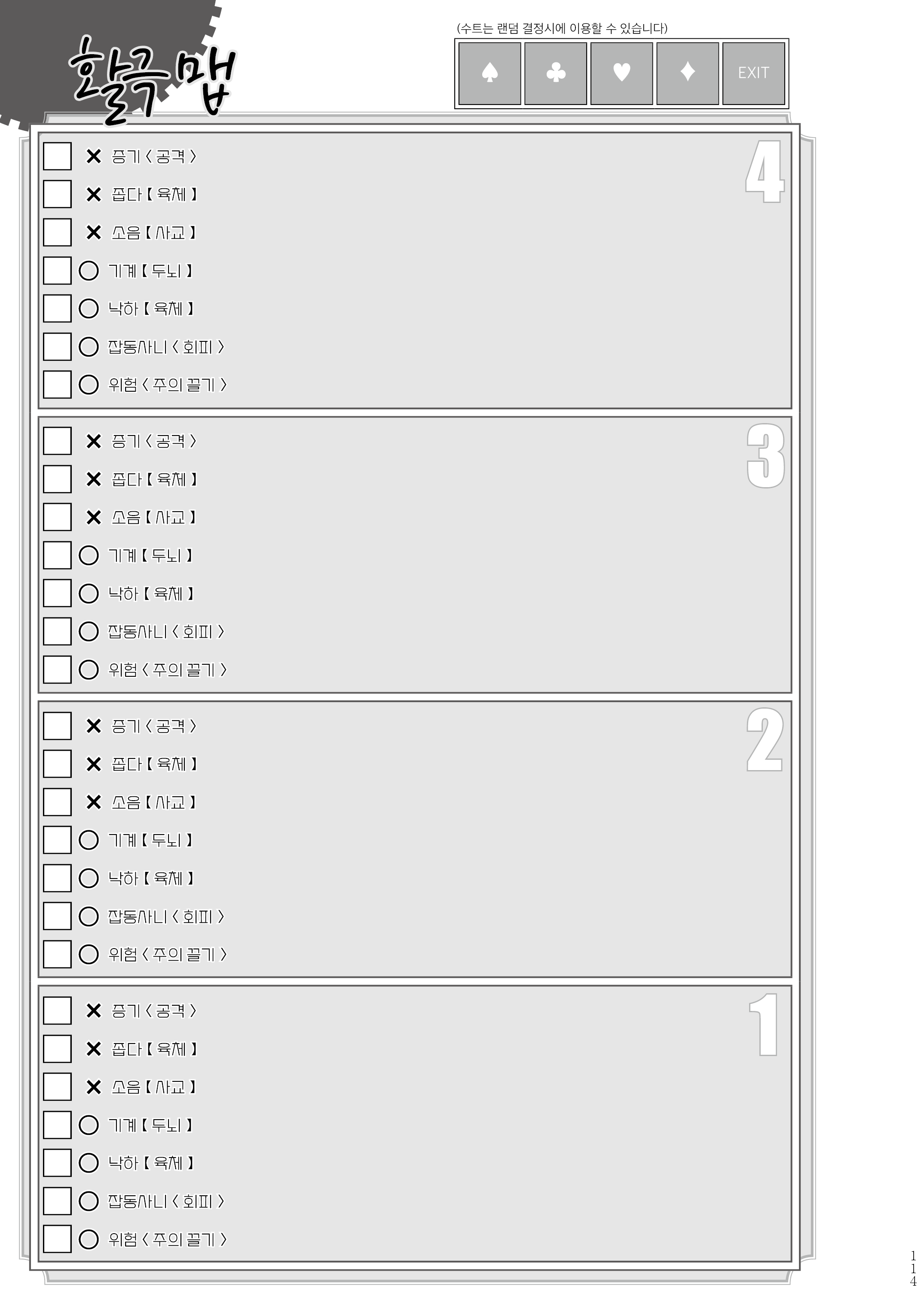 증벽의 에스피오나지를 플레이하실 때 인쇄하여 사용하실 수 있는 활극맵과 캐릭터 시트입니다.