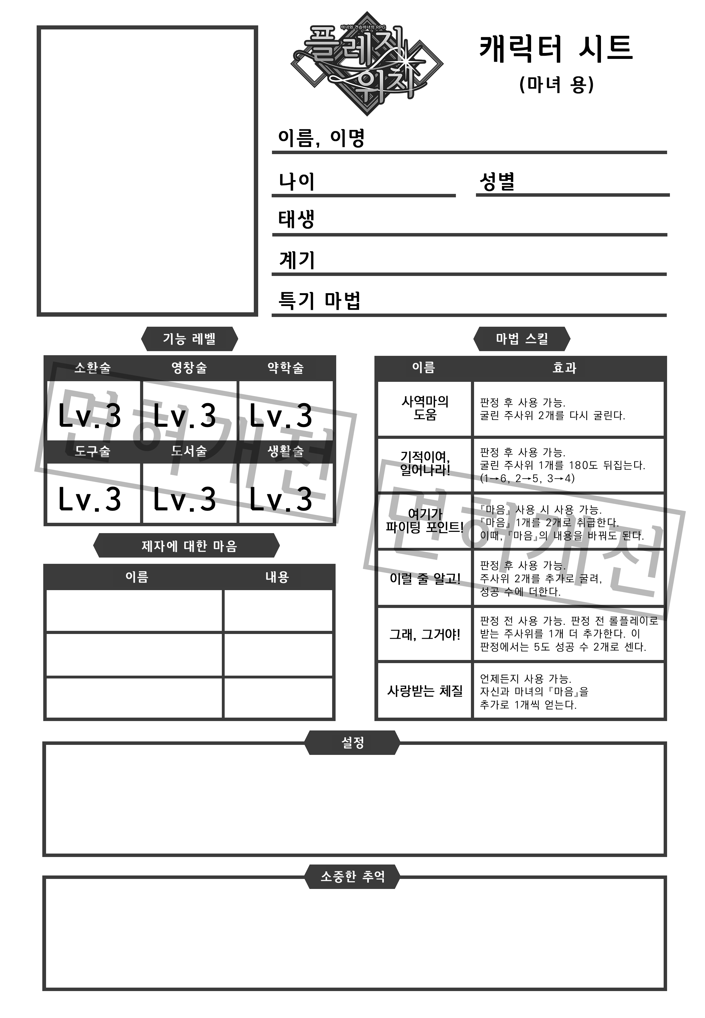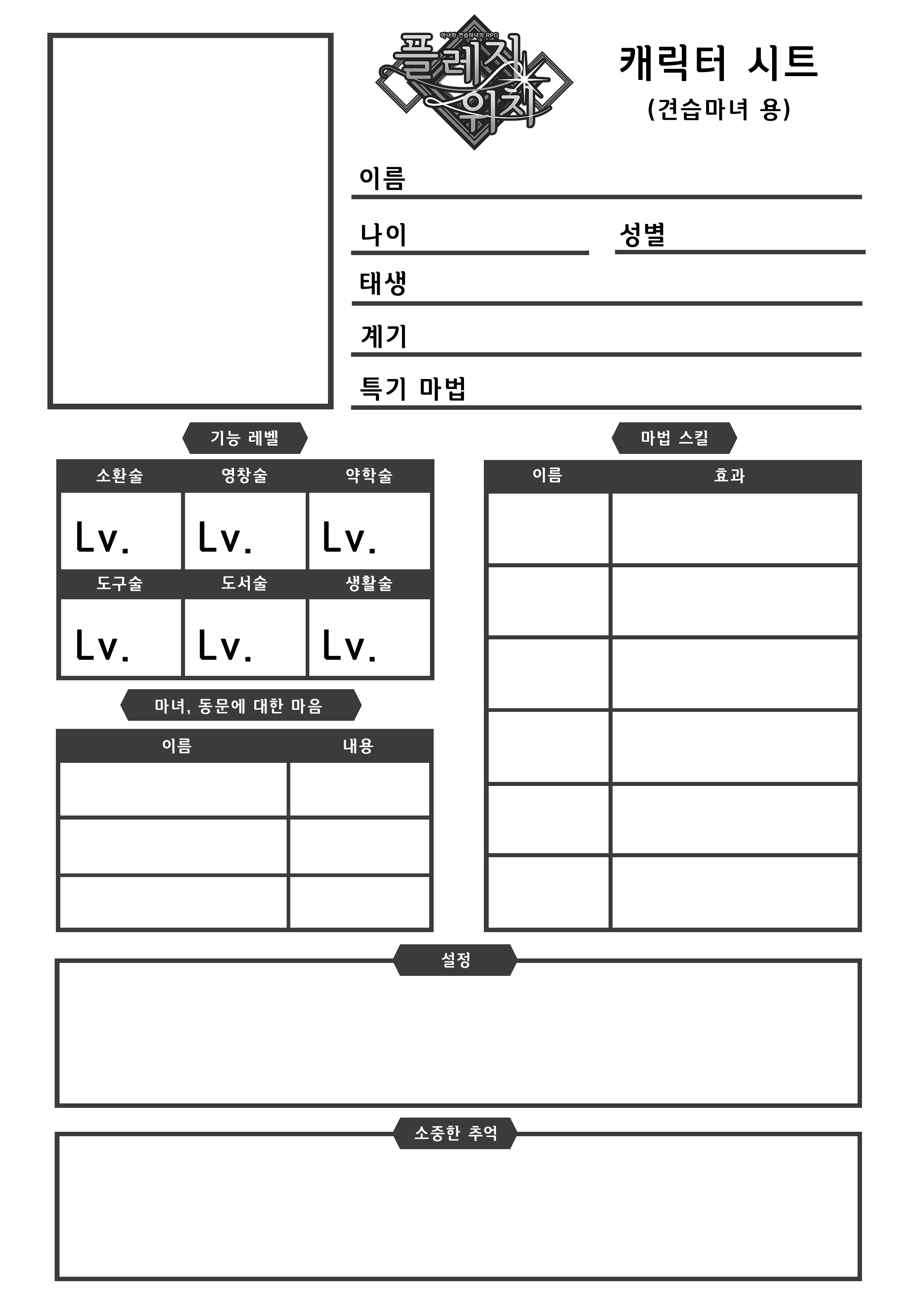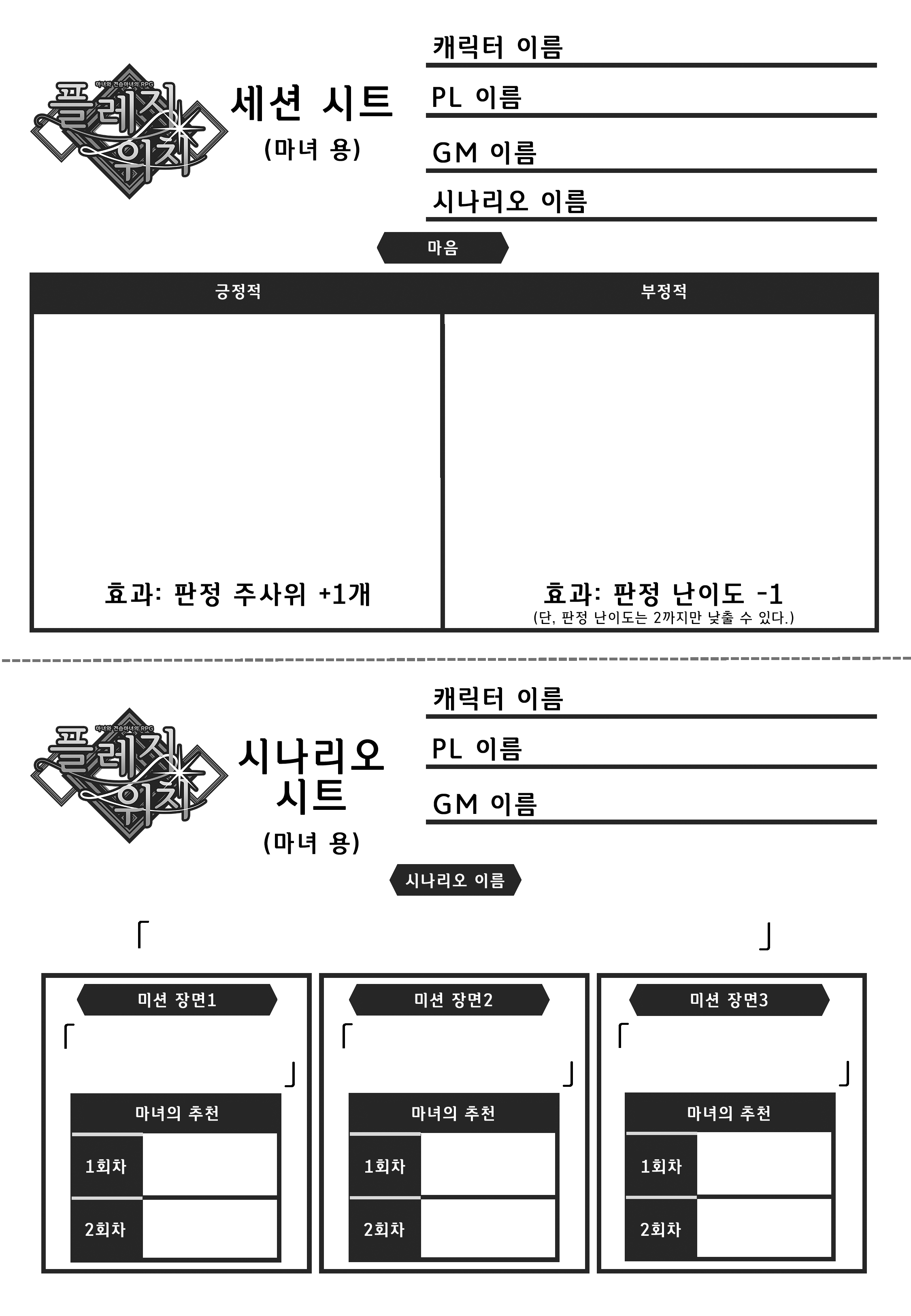 플레지위치를 플레이하실 때 인쇄하여 사용하실 수 있는 캐릭터 시트와 세션 시트입니다.