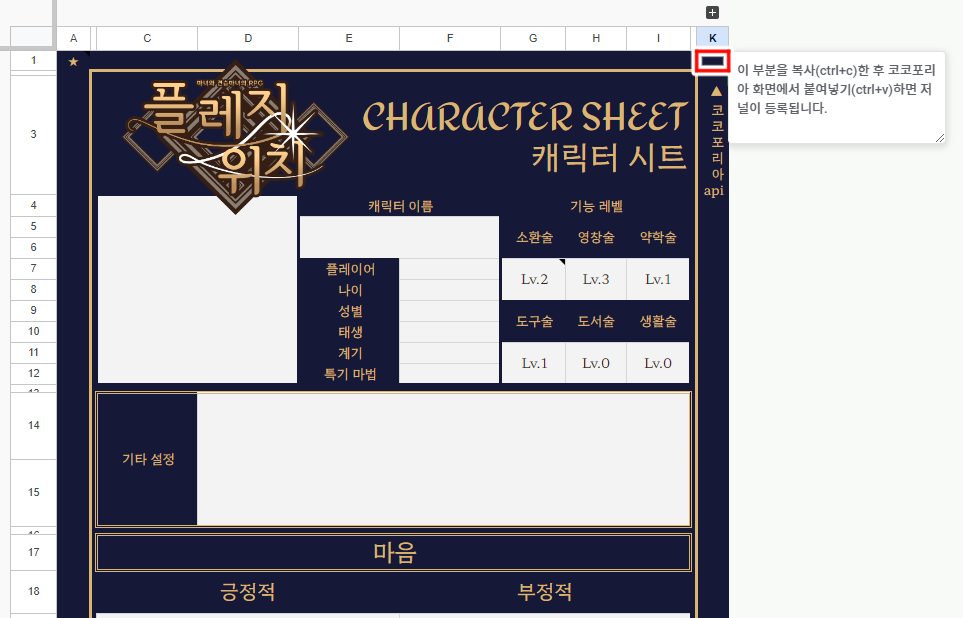플레지위치 캐릭터 (구글 스프레드) 시트입니다.