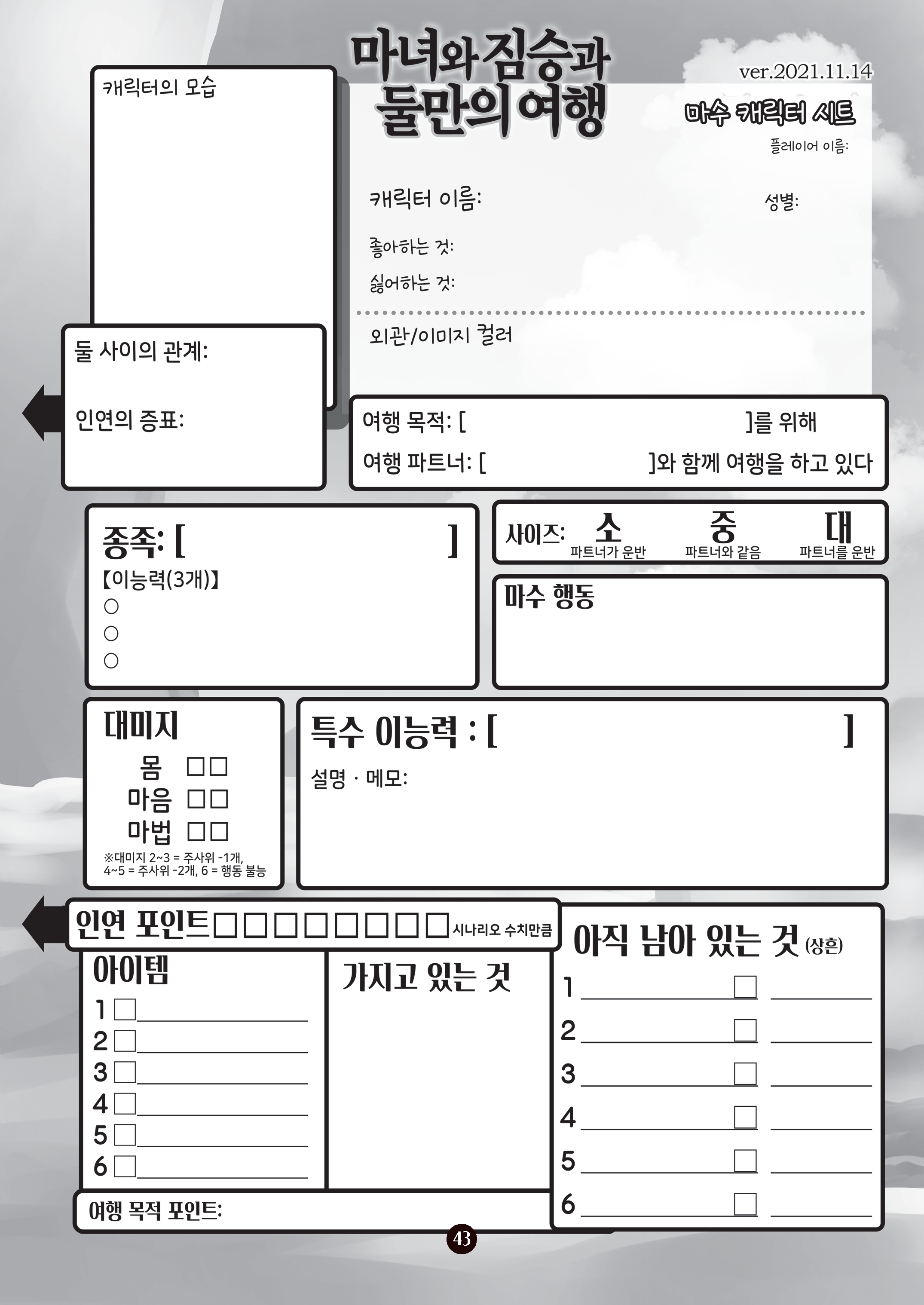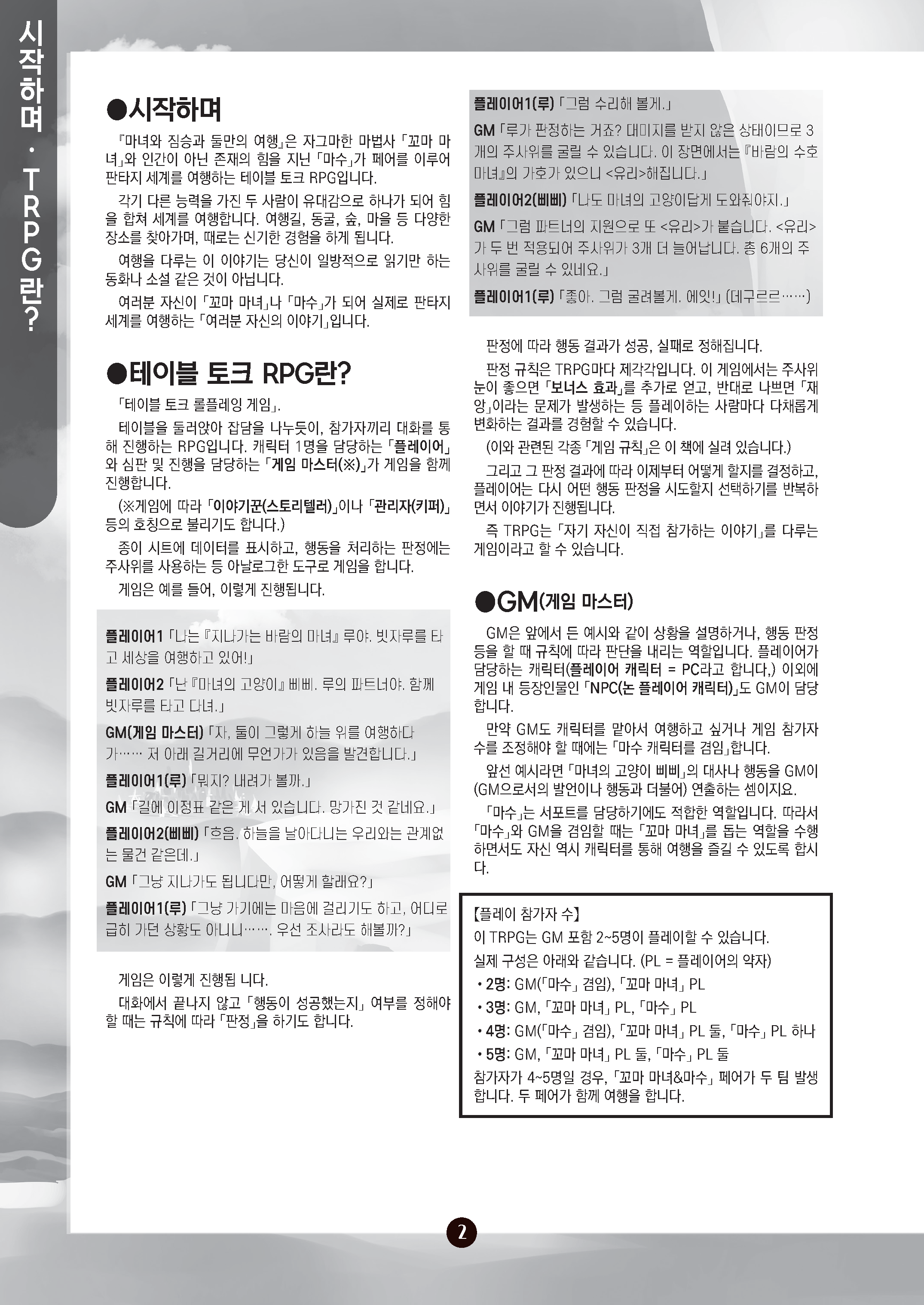 세 번째로 소개드릴 작품은, 코토노하 게임즈의 '마녀와 짐승과 둘만의 여행'입니다.플레이어는 자그마한 마법사 '꼬마 마녀'와 인간이 아닌 존재의 힘을 지닌 '마수'가 페어를 이루어판타지 세계를 여행하는 테이블 토크 RPG입니다.