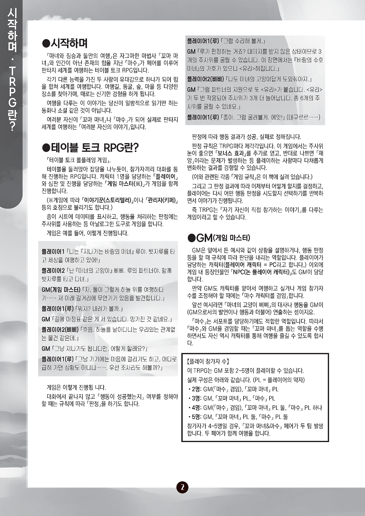 세 번째로 소개드릴 작품은, 코토노하 게임즈의 '마녀와 짐승과 둘만의 여행'입니다.플레이어는 자그마한 마법사 '꼬마 마녀'와 인간이 아닌 존재의 힘을 지닌 '마수'가 페어를 이루어판타지 세계를 여행하는 테이블 토크 RPG입니다.